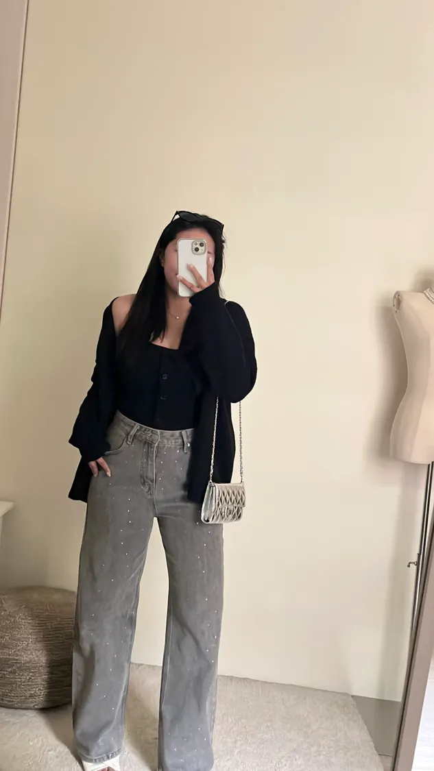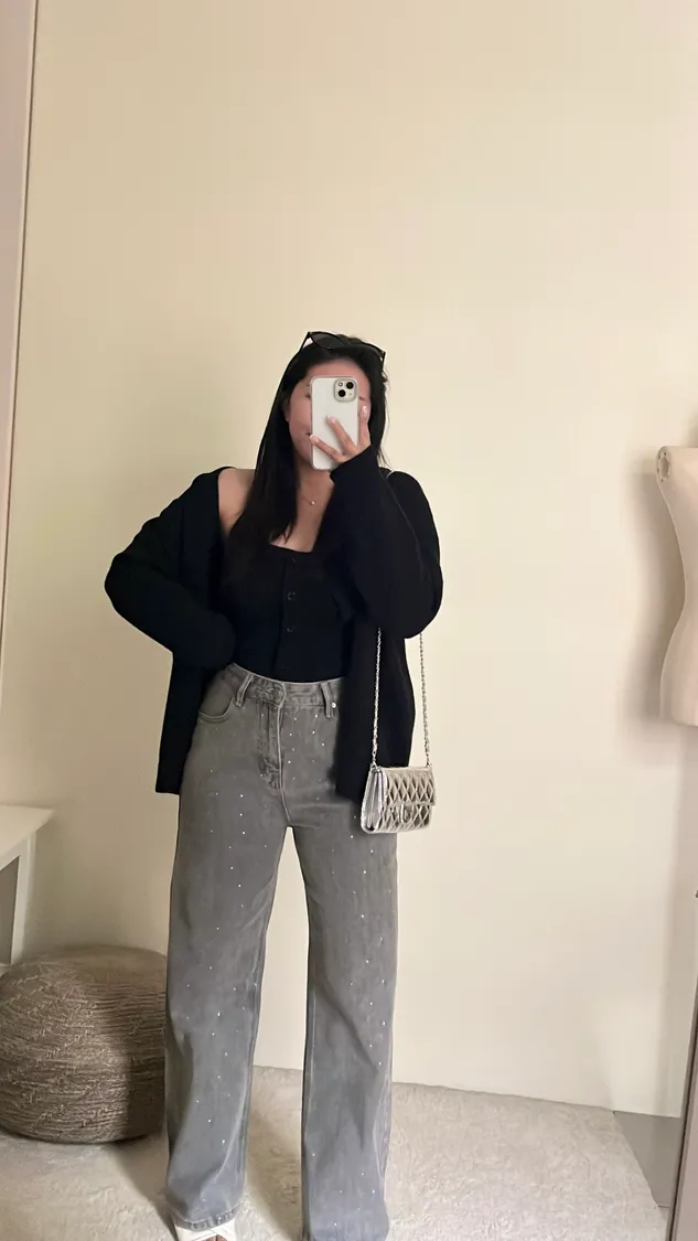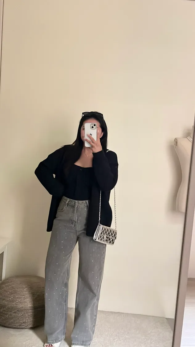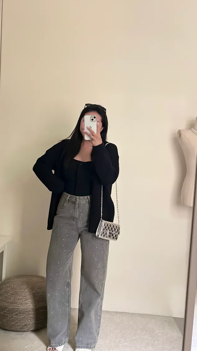 ✨時髦單品閃鑽高腰直筒牛仔褲!