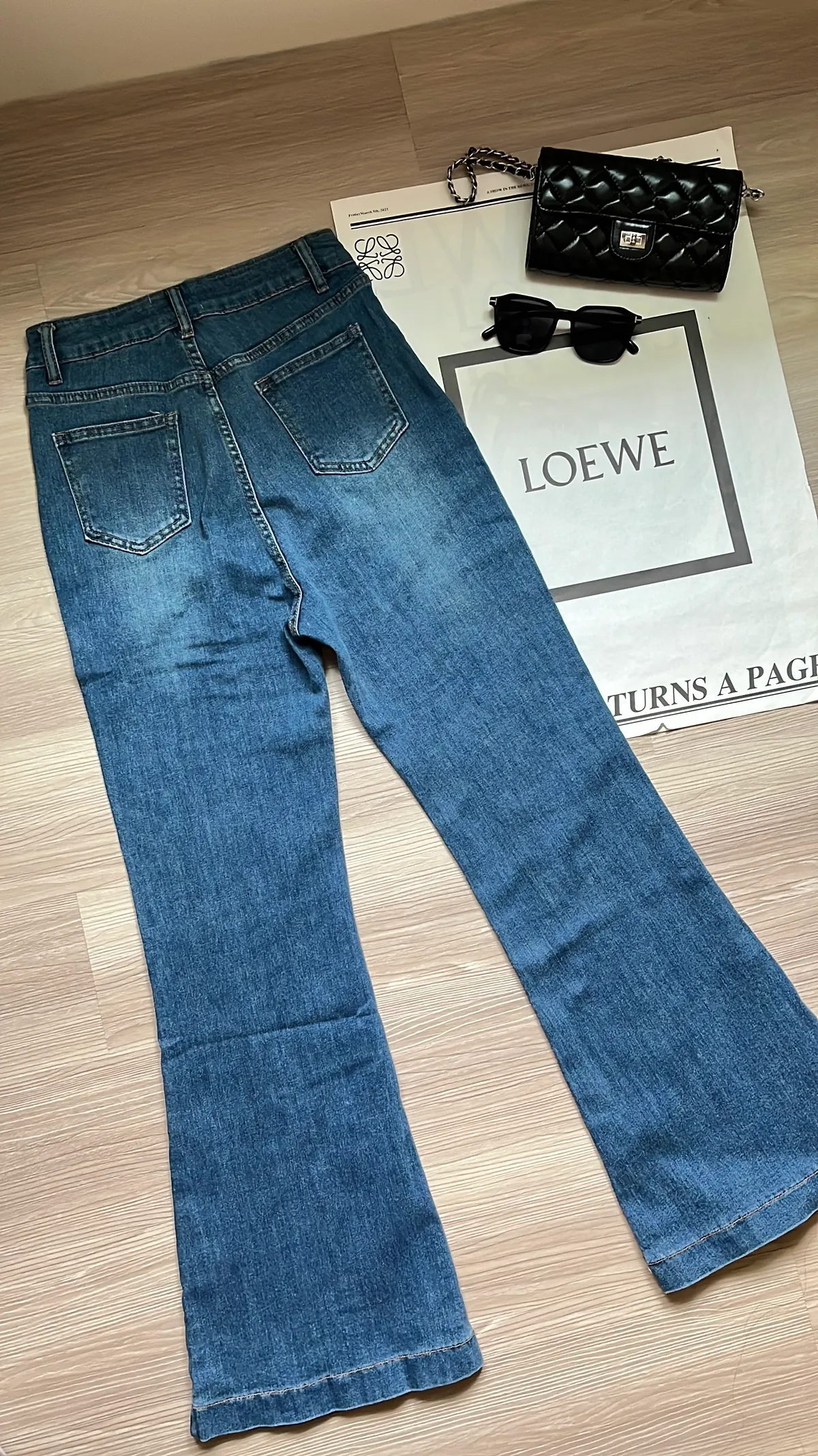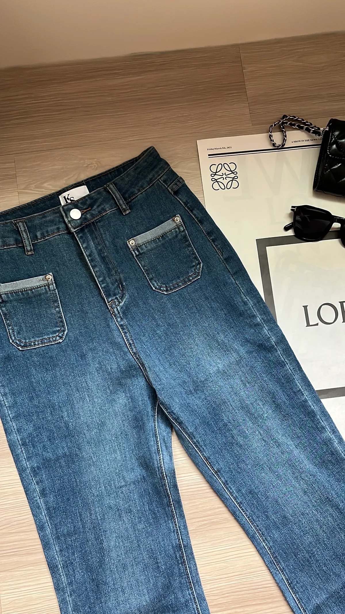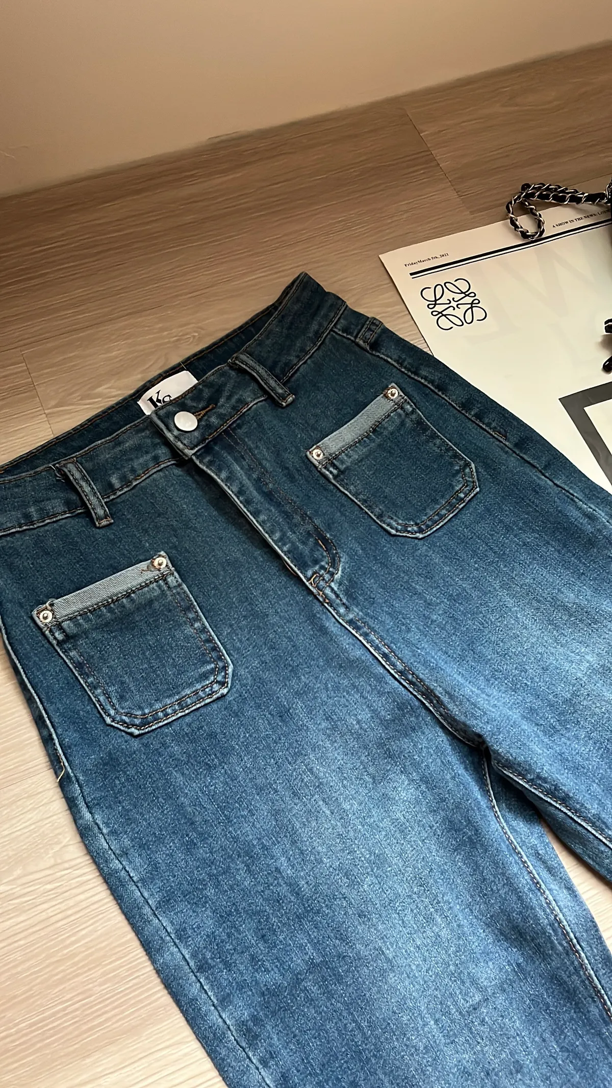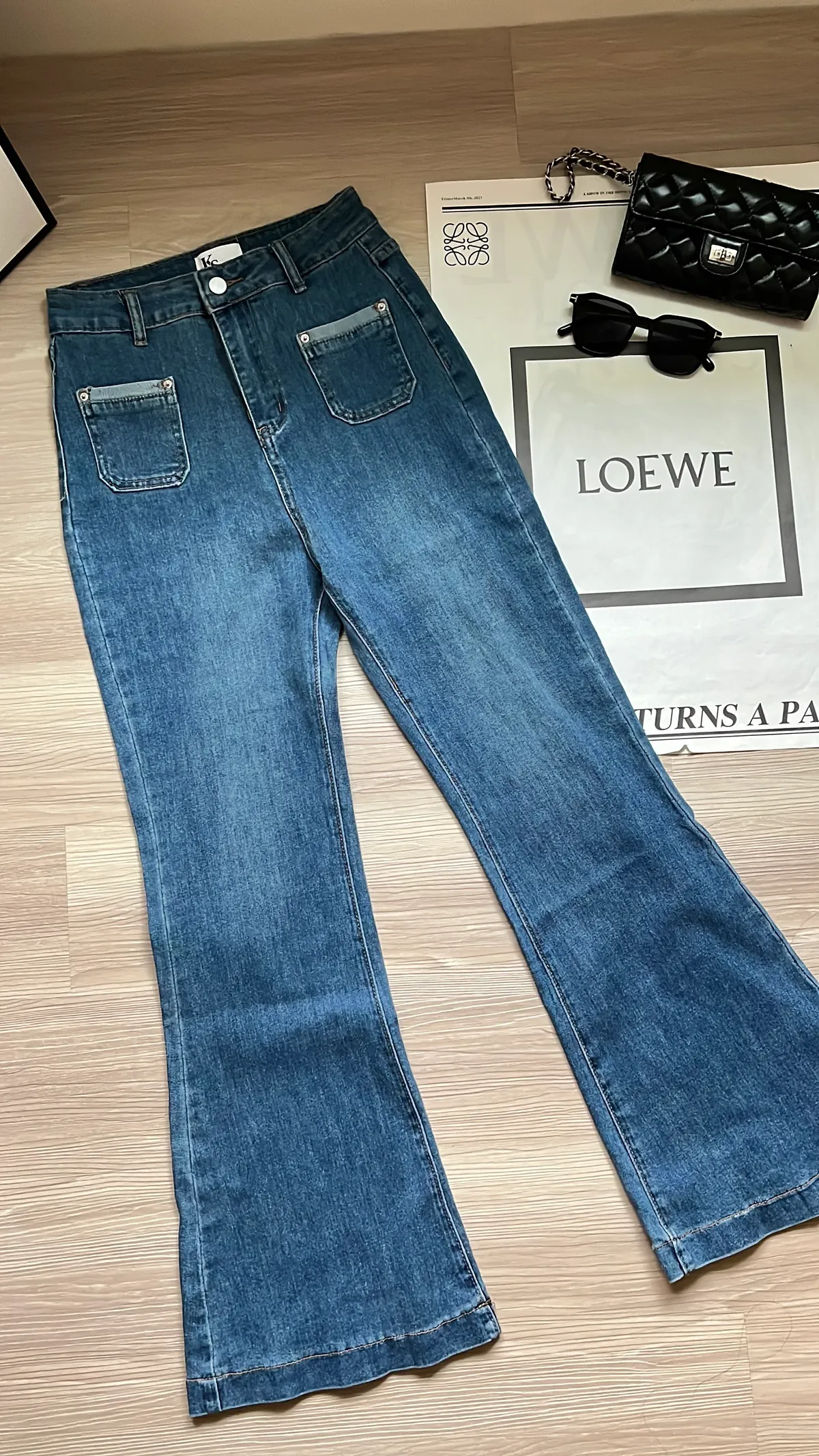 推薦🌟顯瘦高腰前口袋設計彈性微喇叭牛仔褲👖
