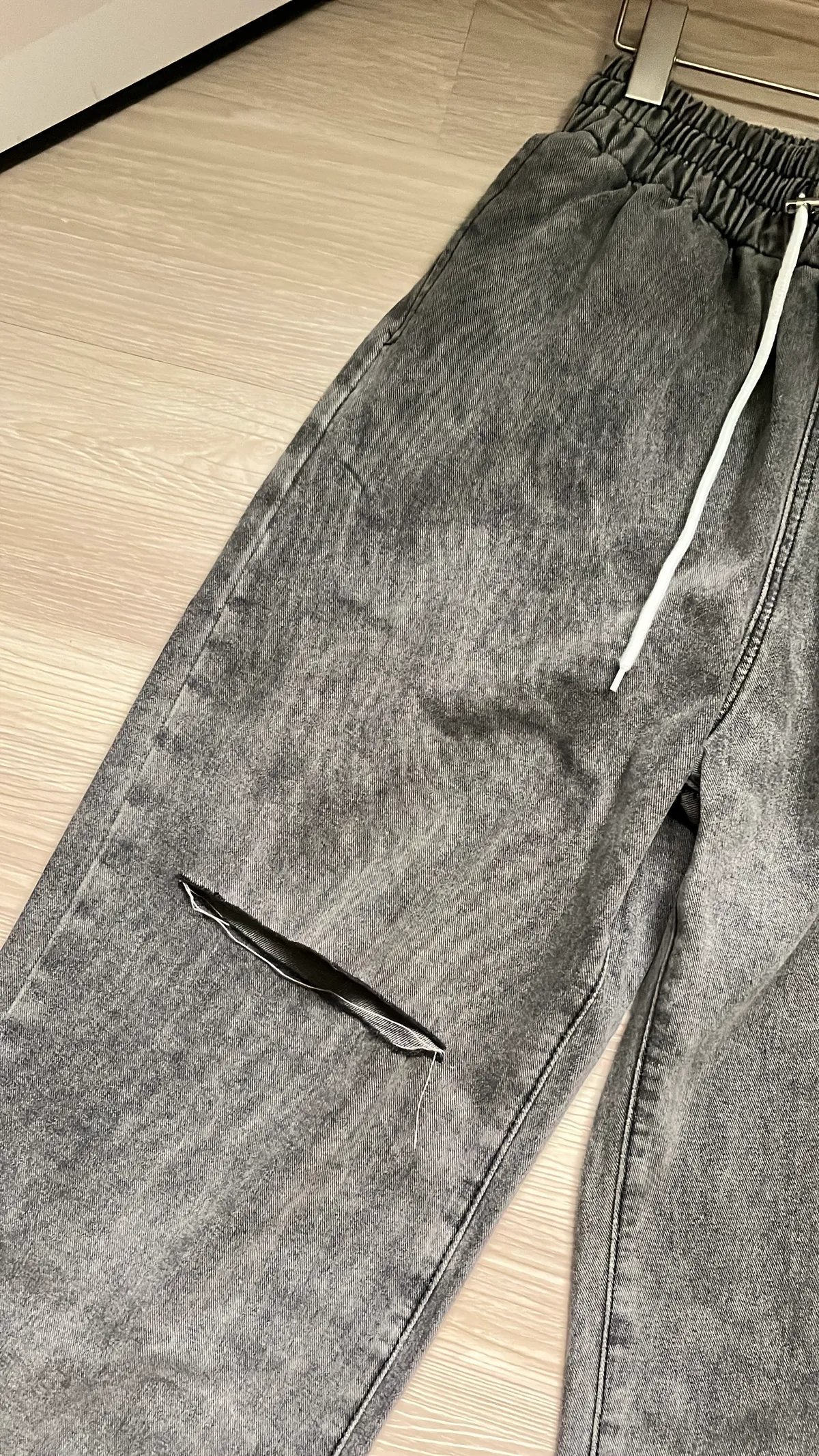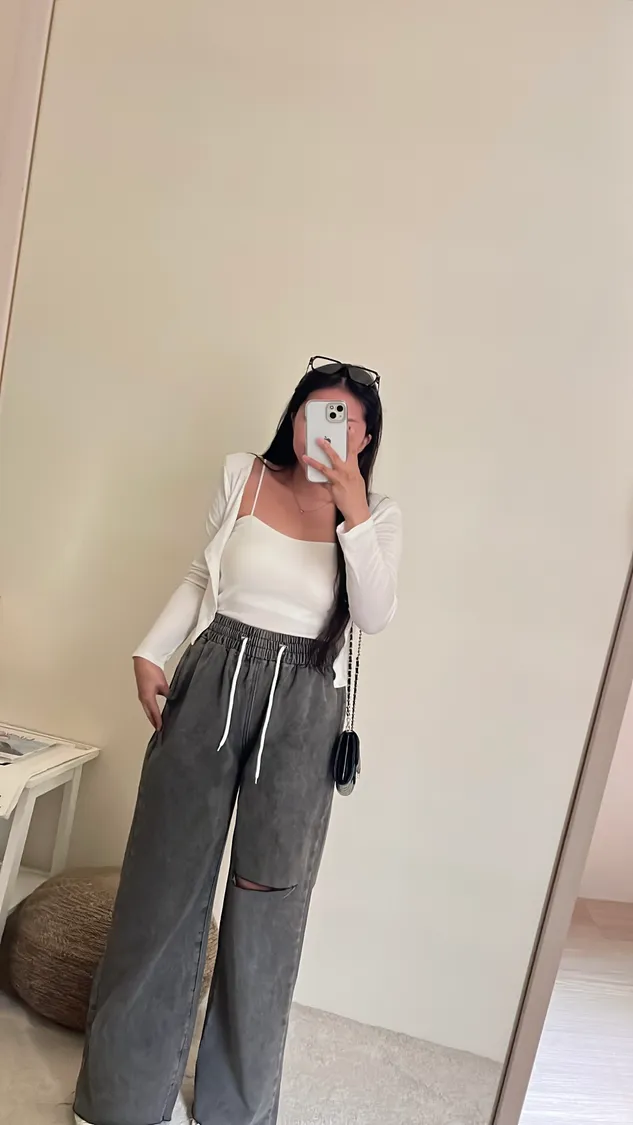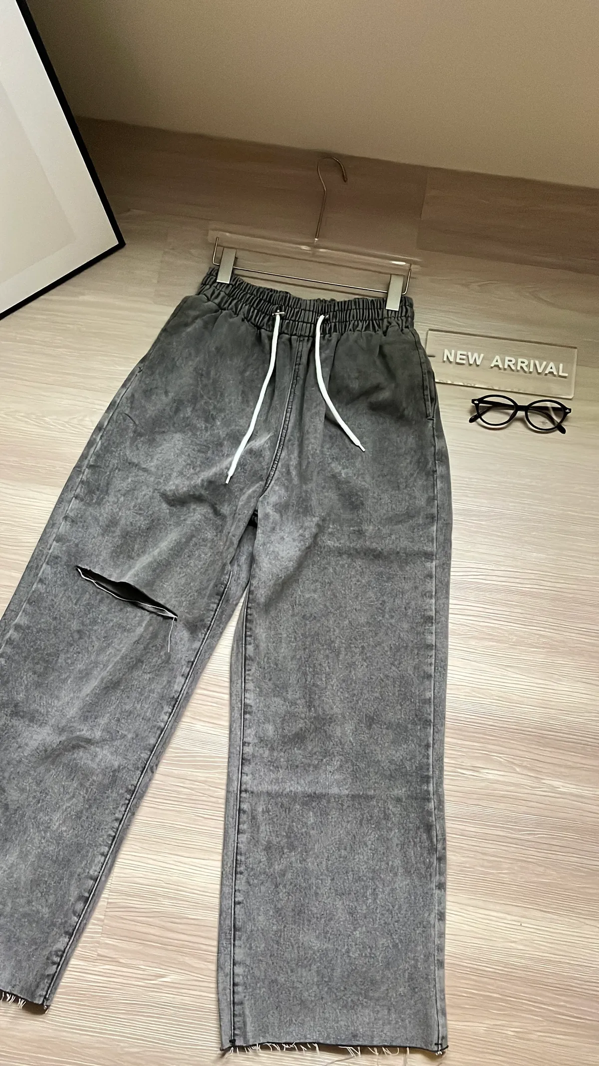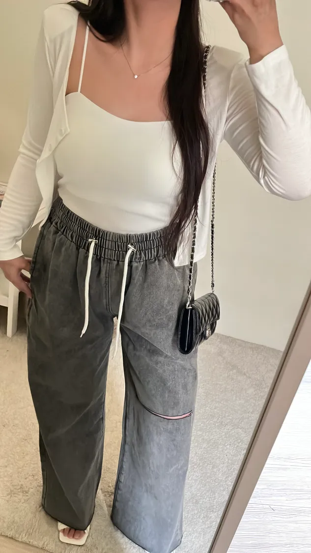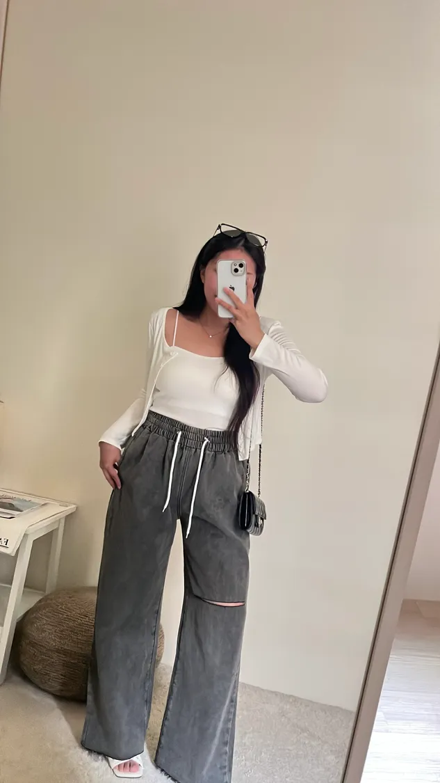 藏肉肉!抽繩割破牛仔落地直筒長寬褲!