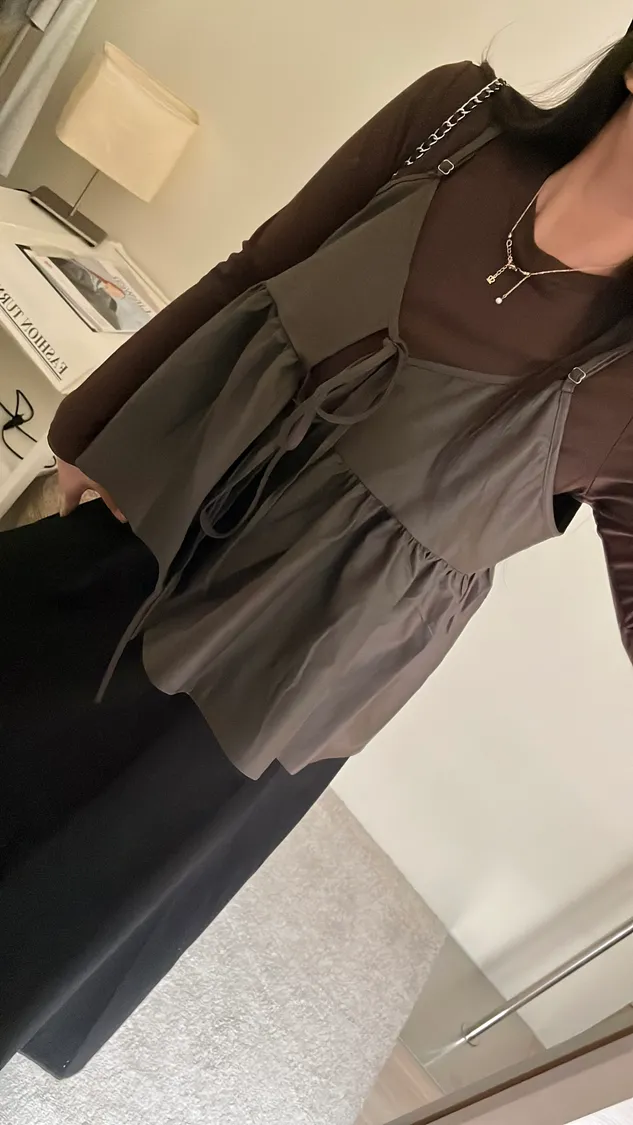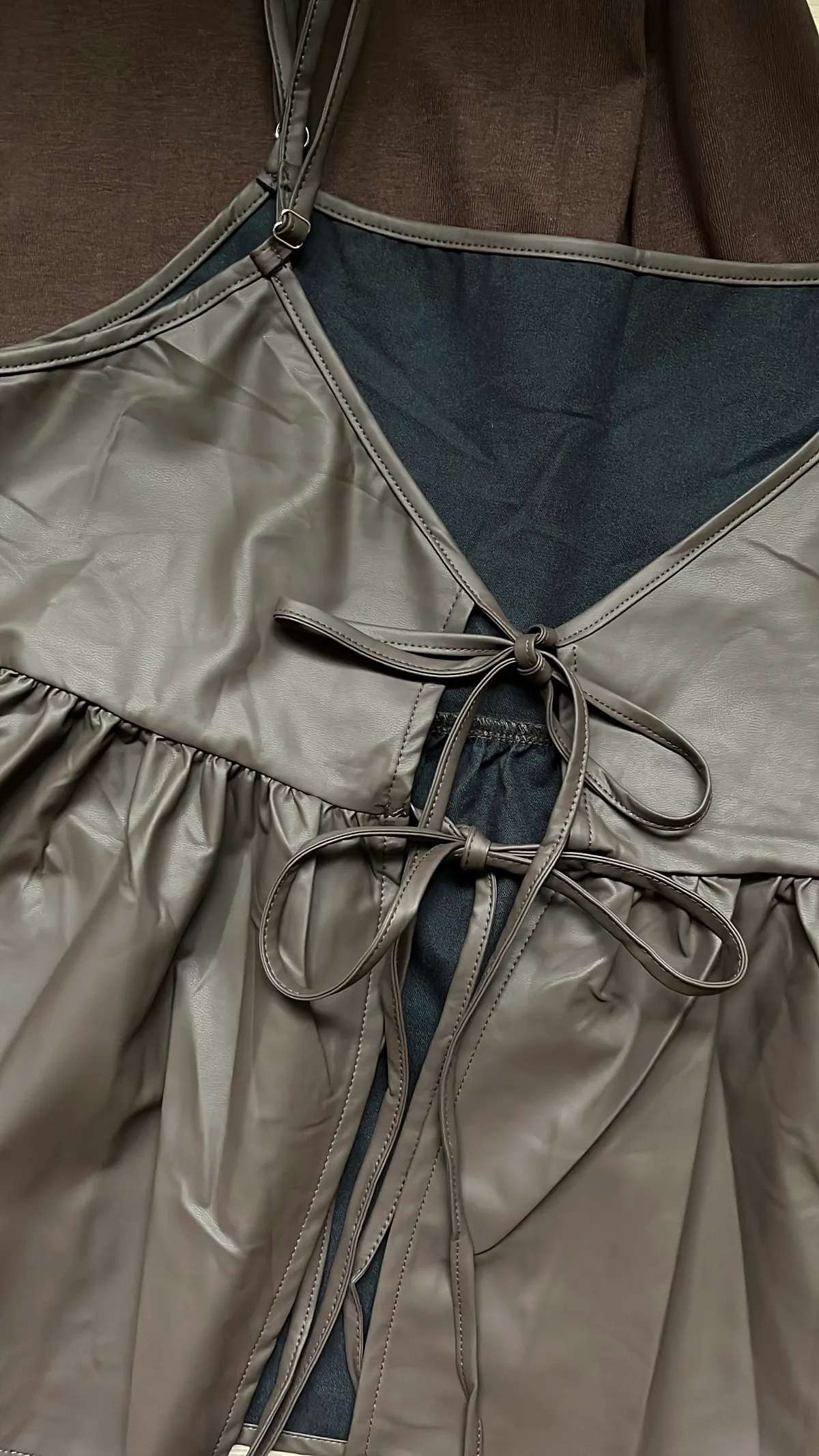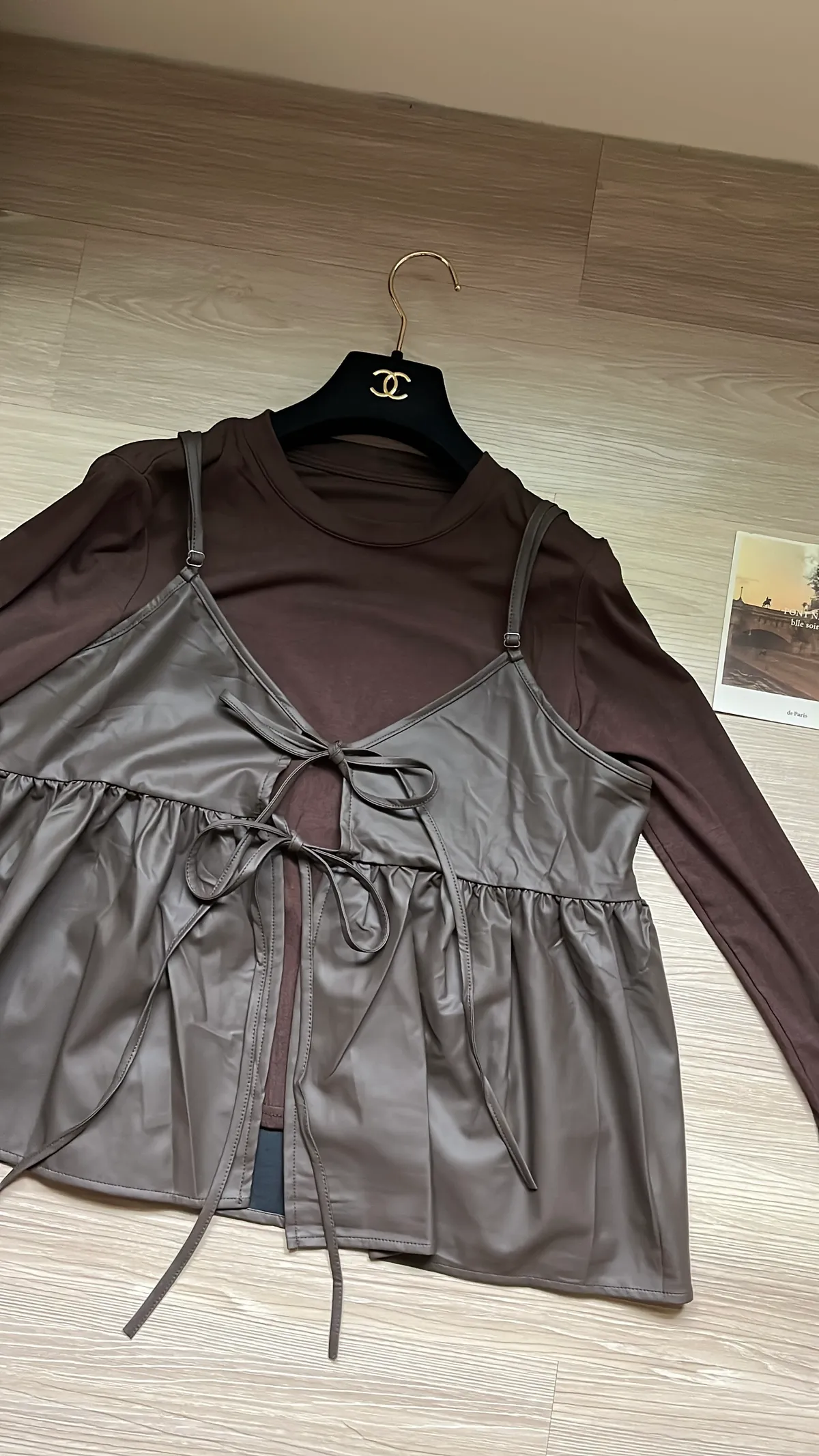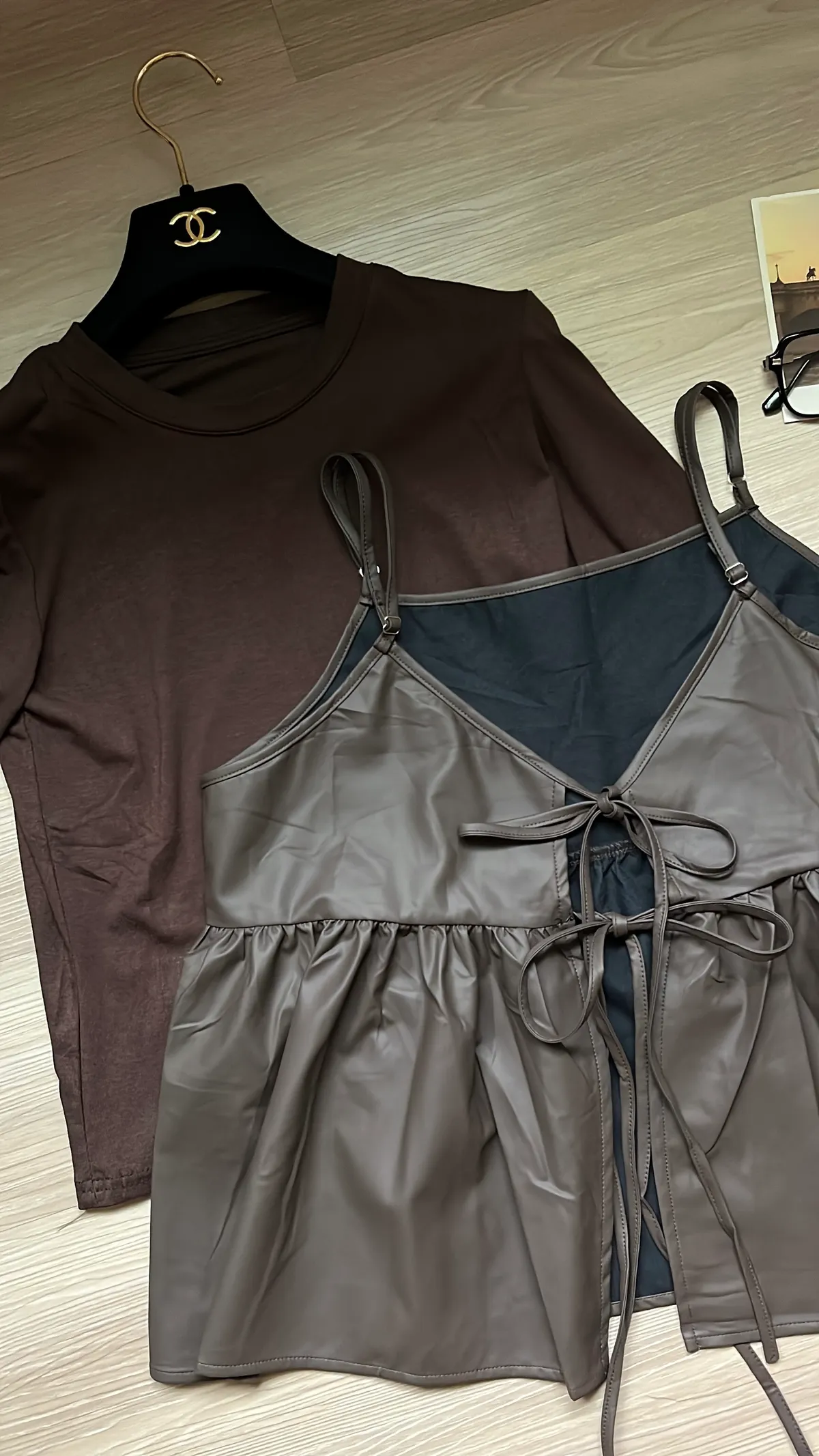 自帶氛圍感! 精緻皮革綁繩背心+基本彈性打底上衣二件組SET