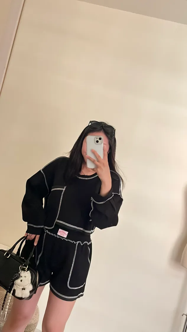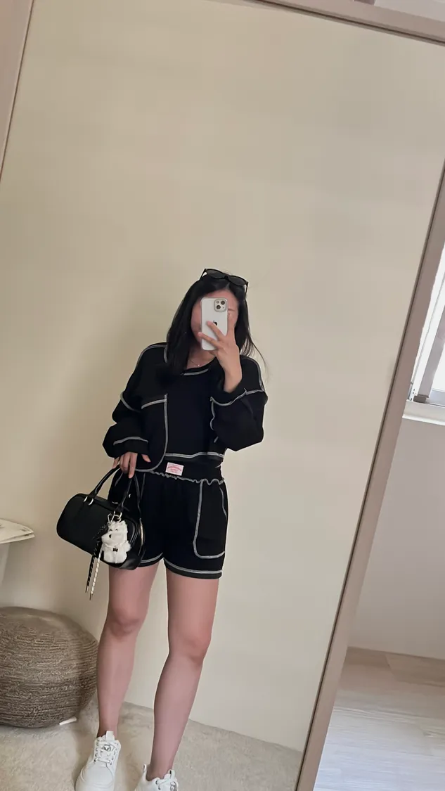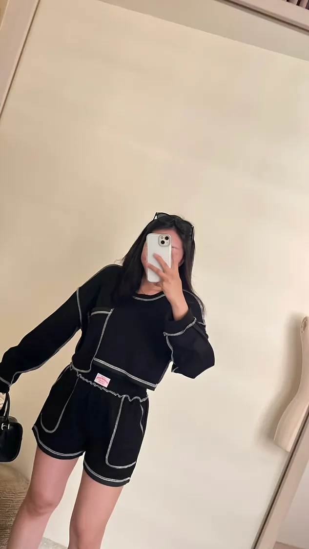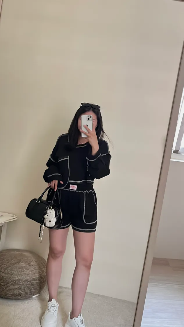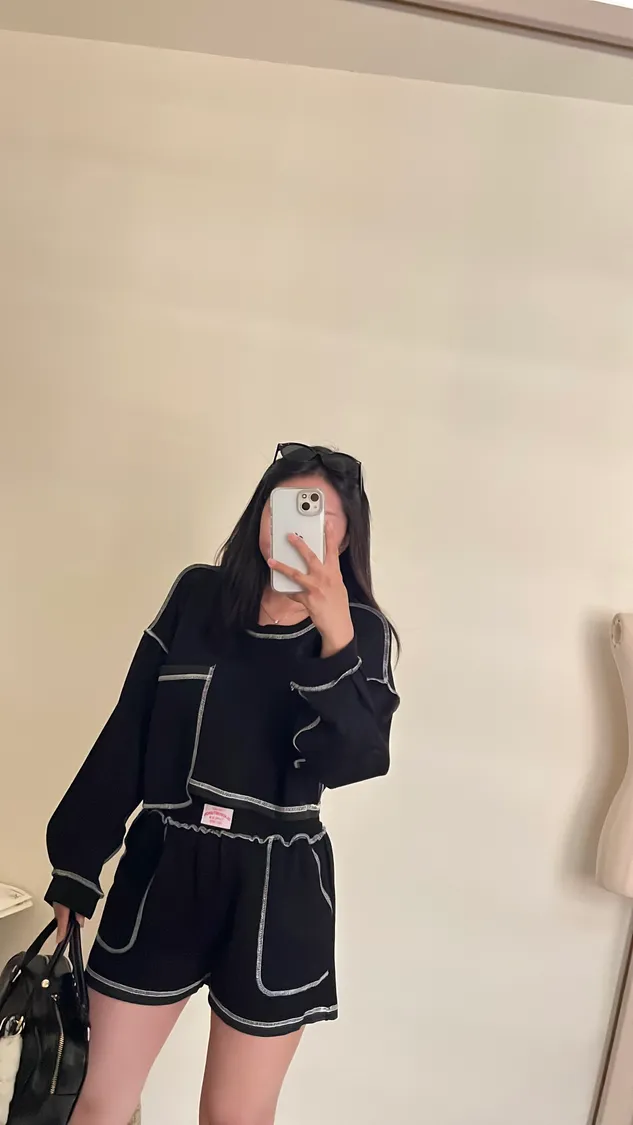 休閒Look!車線太空棉設計長袖上衣+鬆緊短褲二件組SET