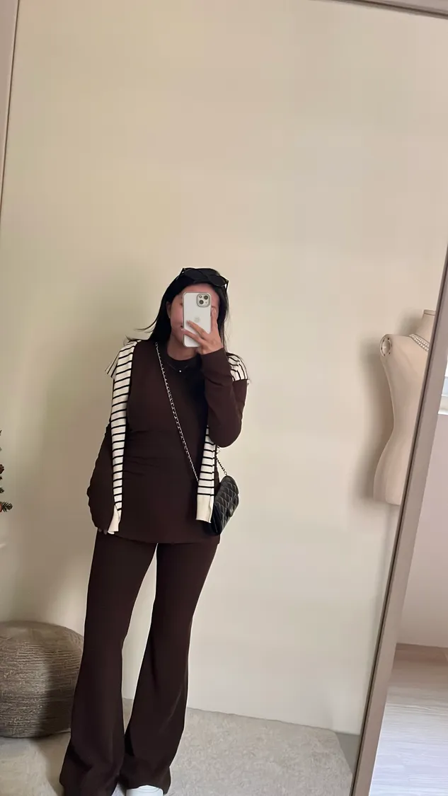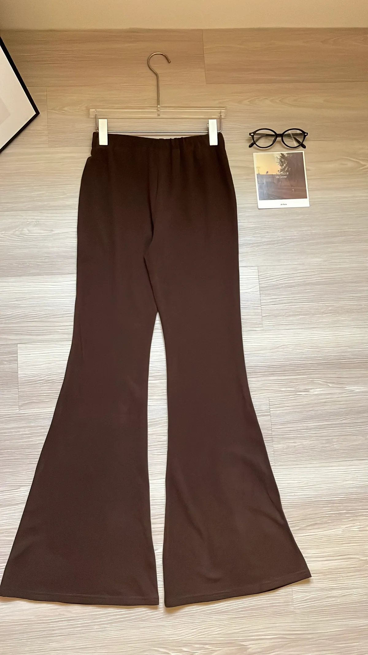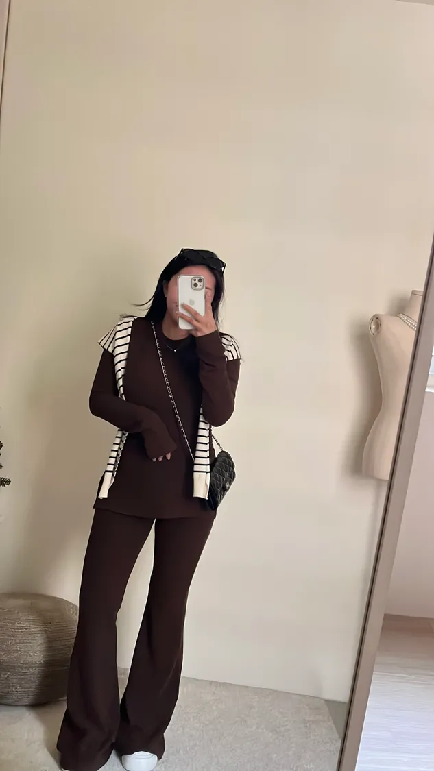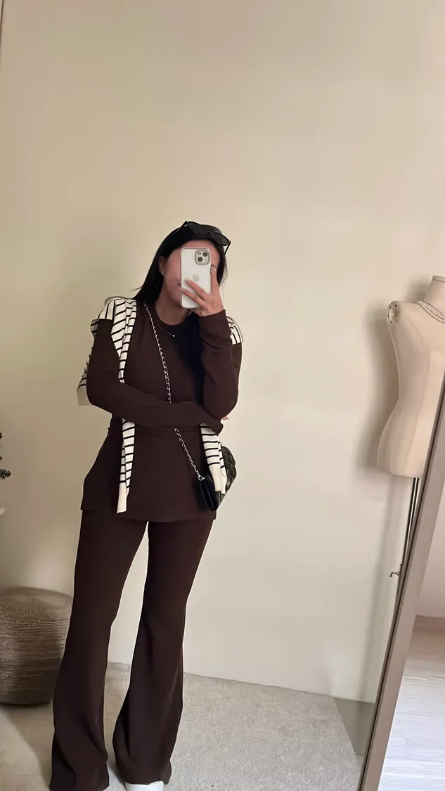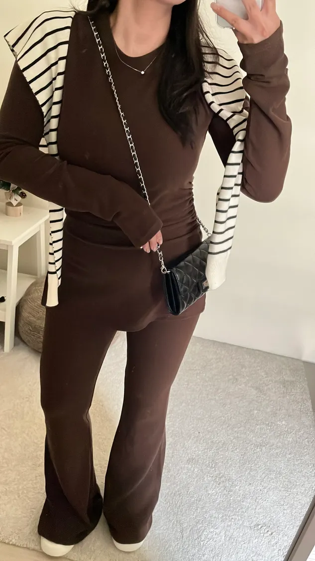 ☕️高級可可棕磨毛彈力抓皺上衣+喇叭褲二件組SET